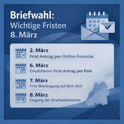 Die Stadt Ludwigsburg erinnert an die rechtzeitige Rückgabe der Briefwahlunterlagen zur Landtagswahl am 8. März. Mehrere Abgabemöglichkeiten stehen zur Verfügung.